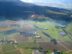 I had the first pullup which was a bit messy but I managed to sort the wing out, but I was running towards a narrow gap in the treeline, without any positive response from the wing. I just could not reach manoeuvering speed on that wet grass so just before the trees, I aborted rather than "hope" I might fit through the narrow gap. While I was walking back with my gear, Russell pulled up and launched on his first attempt. Then Peter tried and had almost exactly the same problem as Russell. I was ready for my second attempt and this time I made sure the wing turned towards open ground. I used some prop-blast to get the wing up and it made an improvement. I was running like crazy, gradually applying brake, until I started to lift off. The initial climb was surprisingly slow until I realised we were in broken air on the ground, as there was a fresh Easterly just above treetop height.